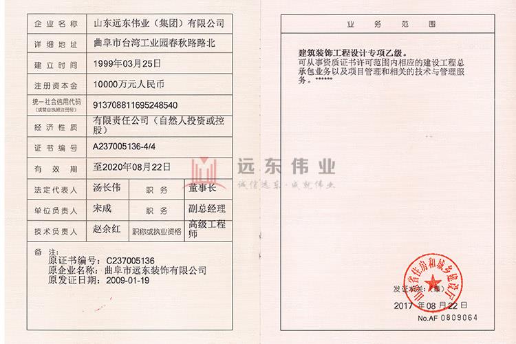 建筑裝飾工程設(shè)計(jì)專(zhuān)項(xiàng)乙級(jí) 2023-09-13 09:20:26 上一條:建筑門(mén)窗行業(yè)資格證書(shū) 下一條: 塑料窗節(jié)能認(rèn)證證書(shū) 相關(guān)資訊 夯實(shí)基礎(chǔ)·砥礪奮進(jìn) | 重慶龍... 正在施工的和新承接的項(xiàng)目情... 近年完成的類(lèi)似項(xiàng)目情況表... 關(guān)于加強(qiáng)項(xiàng)目部農(nóng)民工工資支... 熱門(mén)推薦 黃海明珠中心 濟(jì)寧運(yùn)河城 開(kāi)發(fā)區(qū)萬(wàn)達(dá)廣場(chǎng) 中國(guó)重汽濟(jì)寧商用車(chē)有限公司